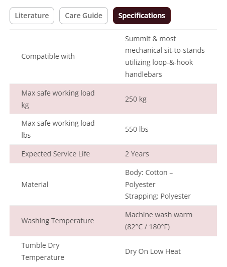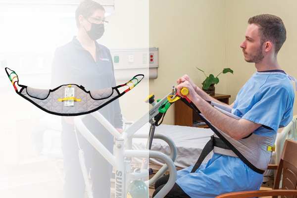 The washable sit to stand sling is designed to move a patient easily and comfortably. This sling incorporates a non-slip padded back panel, multi-loop adjustable interface, and is color-coded for sizing. The safe working load is 550 lbs.